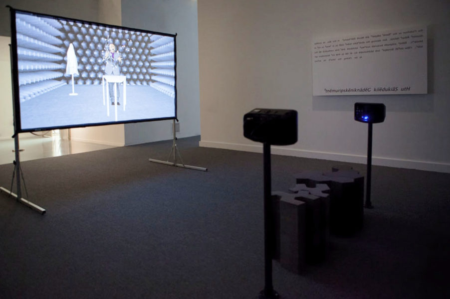 Video-/Soundinstallation, HD Videoprojektor, freistehende Projektionsfläche, Mediaplayer, zwei Aktivlautsprecher auf Stativen, 2 Hocker-Versionen aus Schaumstoff, Wandtext, Farbe, Ton, 22:48 min