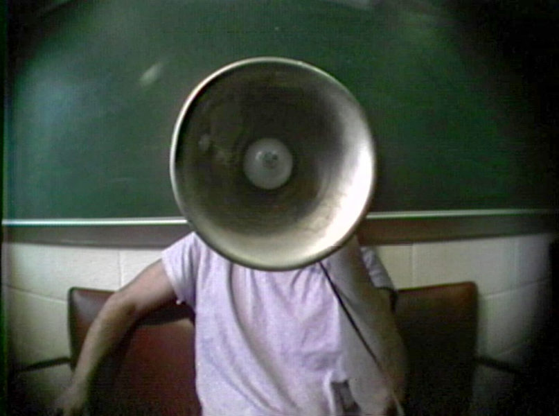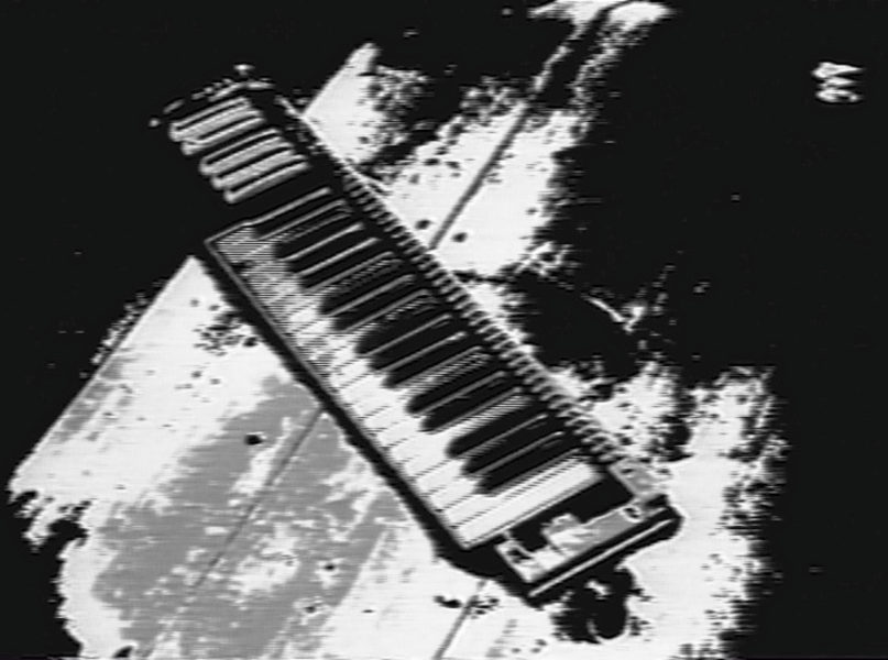 Video-/Soundinstallation, 3"-schwarz-weiß-Monitor, Aluminiumrohr, Laserdisc, 2 Bildplattenspieler, 3 Lautsprecher, schwarz-weiß, Ton, 14:59 min