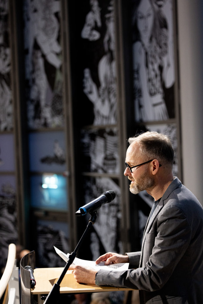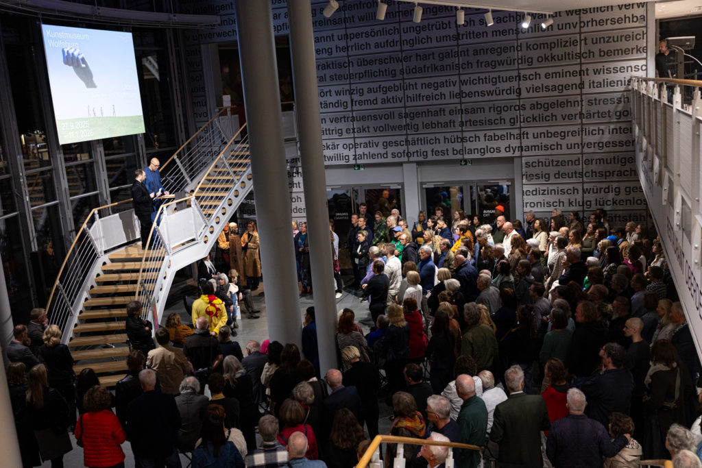 Um 19 Uhr folgten die Eröffnungsreden von Direktor Andreas Beitin, ein Grußwort von Claudia Kayser sowie die Einführung in die Ausstellung durch Dino Steinhof und Sebastian Mühl. Direkt im Anschluss öffneten wir die Ausstellungshalle und luden die Gäste ein, die vielfältigen künstlerischen Perspektiven auf Hoffnung, Zusammenhalt und neue Zukunftsmodelle zu entdecken.